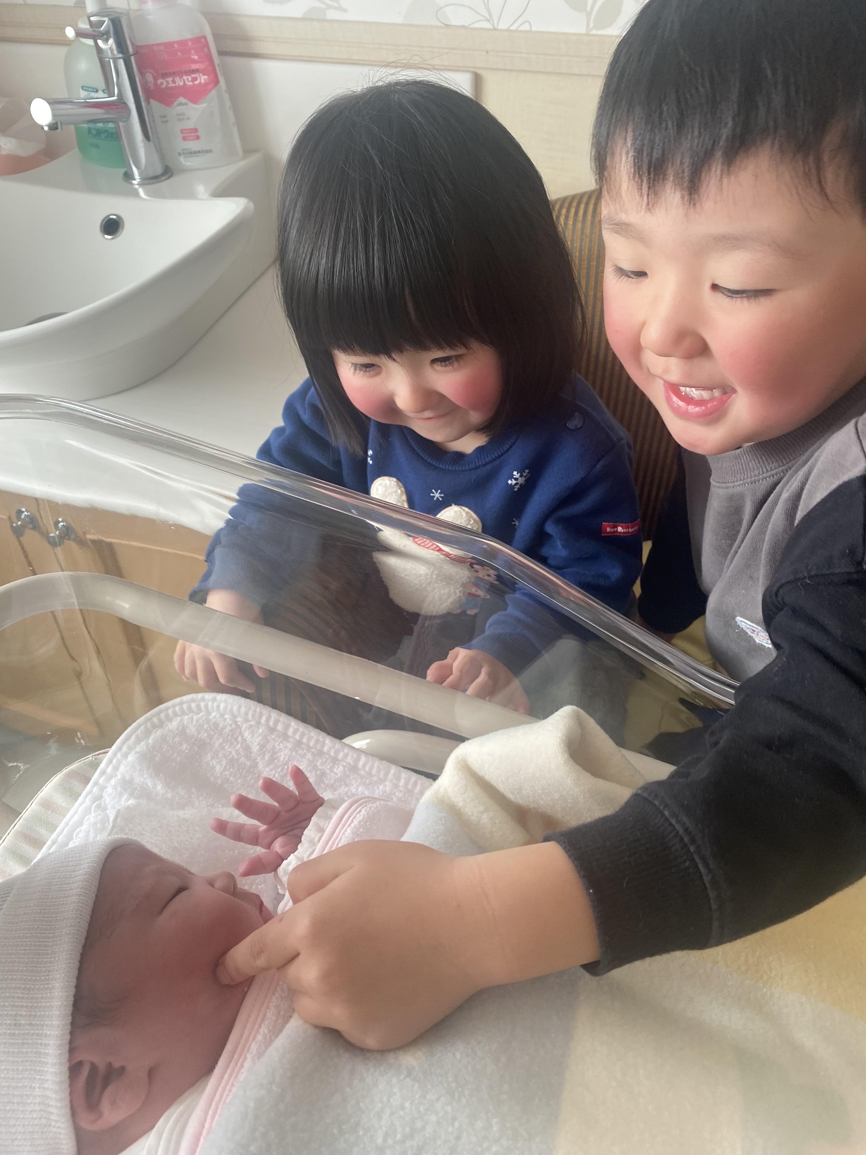 新たな命の誕生を喜ぶ兄妹たちの表情がとてもかわいらしい一枚です。頬に触れる手からは喜びだけでなく、お兄ちゃんとして成長していく姿を想像させられるような愛情が詰まった瞬間です。