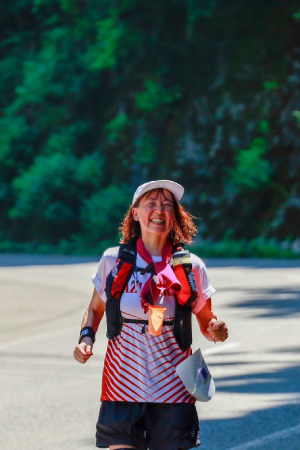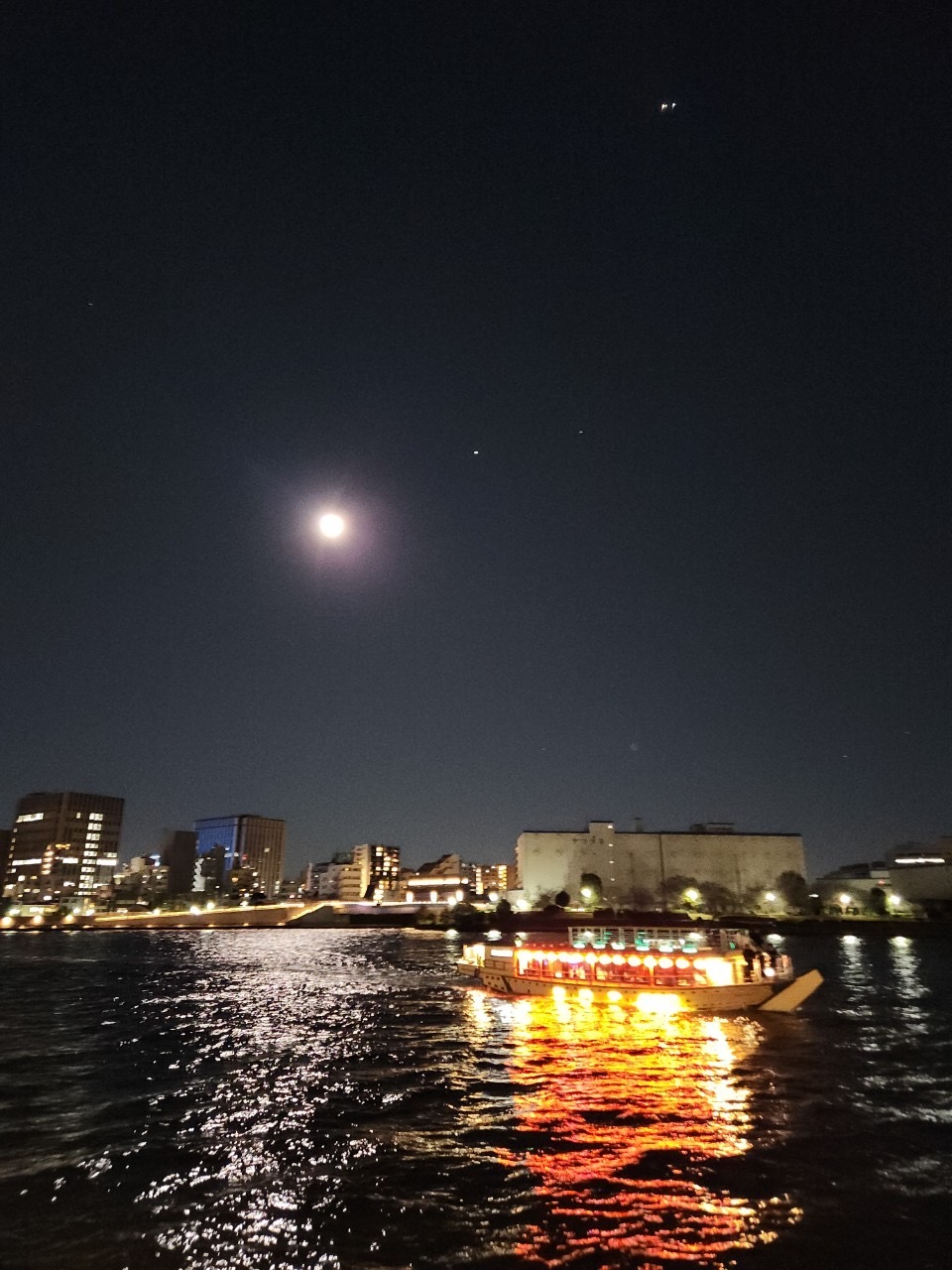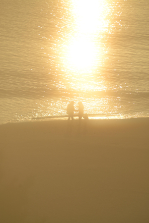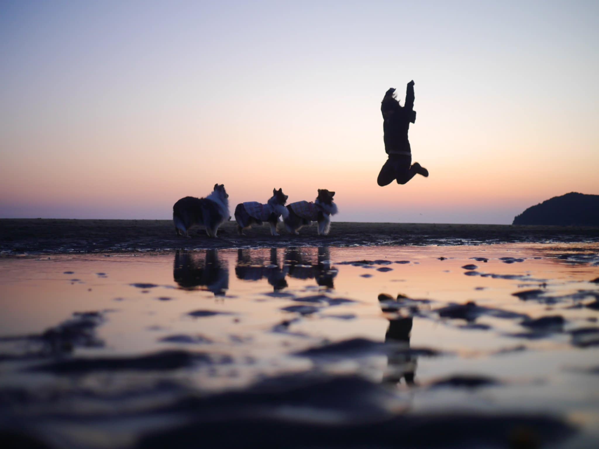 低い位置で撮影することで、水面の反射を利用し、シンメトリーを生かした構図となっています。ジャンプする主人を見守るような愛犬たちのシルエットがかわいらしく、夕日のグラデーションも美しく幻想的な作品です。